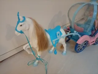 Set de juego de carroza de princesa con muñeca y caballo. En muy buen estado. - Carroza de color azul y rosa con detalles brillantes. - Muñeca con vestido de princesa azul y tiara. - Caballo blanco con bridas azules.