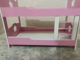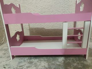 Bonita litera para muñecas, ideal para juegos de simulación. - Estructura de madera pintada en rosa y blanco. - Diseño con detalles de flores. - Dos niveles para colocar muñecas.