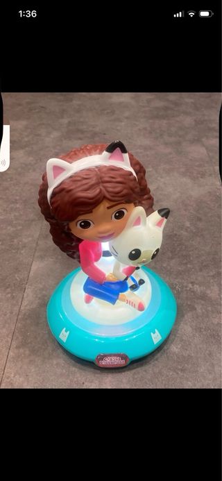 Lámpara decorativa de las Muñecas de Gabby, en excelente estado. - Diseño con personaje y gatito. - Base redonda de color azul. - Adorno con orejas de gato.