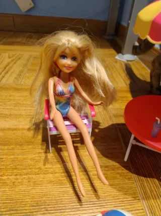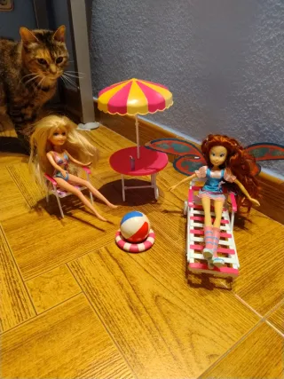 Set de muñecas con temática de playa, ideal para recrear escenas veraniegas. - Incluye dos muñecas. - Accesorios de playa como sombrilla y tumbona. - Pelota y flotador incluidos. Una de ellas con un vestido con alas. El gato no se incluye