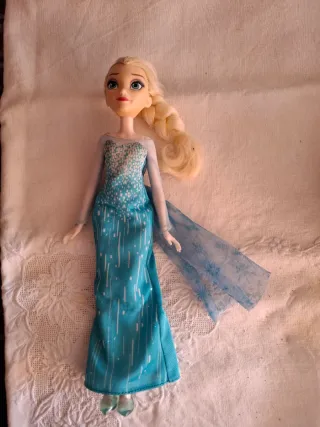 Muñeca de Elsa de la película Frozen. - Vestido azul brillante con detalles blancos. - Capa translúcida con estampado de copos de nieve. - Cabello rubio trenzado.