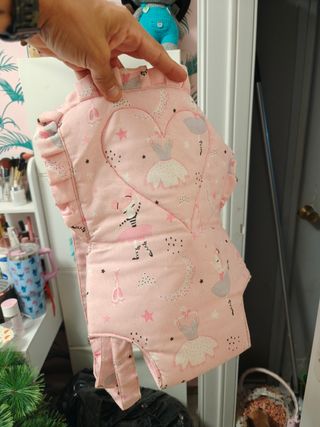 Precioso portabebés para muñecas, ideal para niñas a las que les encanta cuidar de sus muñecas. Es de color rosa y tiene un diseño adorable con bailarinas. - Confeccionado en tela suave y acolchada. - Diseño con forma de corazón. - Incluye correas para sujetar a la muñeca.