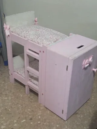 El sueño de cualquier pequeño/a coleccionista de muñecas! Vendo este precioso conjunto de litera doble y armario ropero a juego, fabricado en madera maciza y pintado en un dulce color rosa palo. Detalles del producto: Estructura 2 en 1: Litera de dos niveles con escalera lateral y armario ropero unido. Armario funcional: El armario incluye una barra para colgar la ropita de las muñecas y está forrado en el interior con una preciosa tela de flores. Ropa de cama confeccionados a mano Estado: Muy bien cuidado, con un acabado rústico 80largo.40 ancho.60 alto