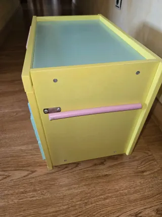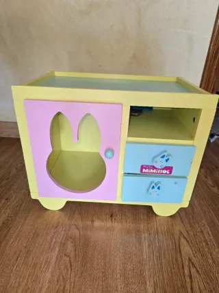 Mueble de madera para jugar con muñecas, con puerta y cajones. - Diseño en color amarillo y rosa. - Puerta con forma de orejas de conejo. - Dos cajones con detalles de conejitos. - Interior en color amarillo.
