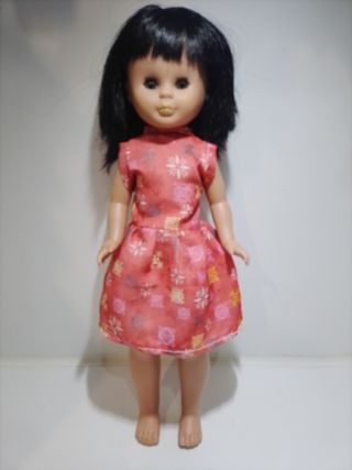 Muñeca Kika con vestido estampado.el tercer molde de nancy - Vestido de color coral con estampado floral. - Pelo negro y ojos grises, tiene una pequeña manchita en la pierna pero apenas se nota , no se si esta cortado el pelo o es asi , ver fotos 3915