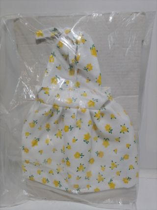 Vestido para muñeca Nancy con estampado de flores amarillas sobre fondo blanco. 3913 - Diseño de tirantes.de pico - Falda con vuelo.