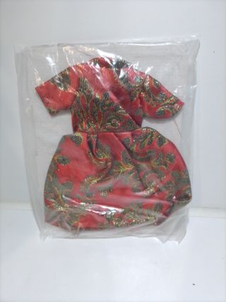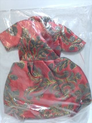 Vestido con estampado floral en tonos rojos y dorados, diseñado para muñecas nancy 3912 - Tejido con detalles metalizados. - Diseño de manga corta y falda. - Ideal para coleccionistas de muñecas.