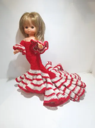 Traje de sevillana hecho a mano en crochet para muñeca Lesly. Presenta un diseño vibrante con volantes.como se ve en la foto un lado esta un poco descosido - Colores: rojo y blanco. - Material: hilo de algodón. - Detalles: volantes en la falda y mangas.