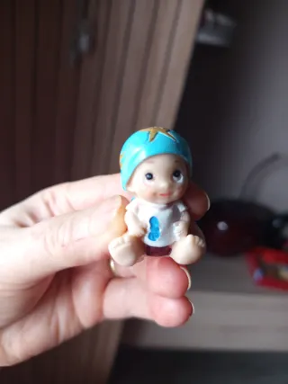 Pequeño muñeco de bebé. - Gorro azul con estrella dorada. - Ropita blanca con detalle azul. - Piernas y brazos visibles.