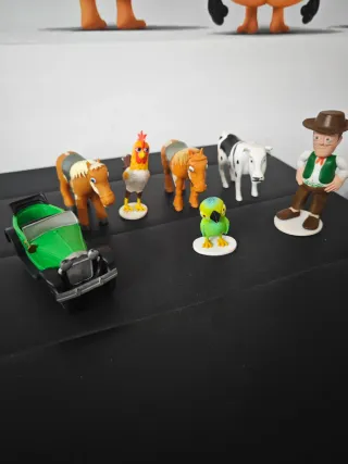 Set de muñecos de la popular serie infantil La Granja de Zenón. Incluye varios personajes. - Muñeco de un granjero con sombrero. - Muñeco de una vaca. - Muñeco de un caballo. - Muñeco de un gallo. - Muñeco de un loro. - Coche verde.
