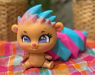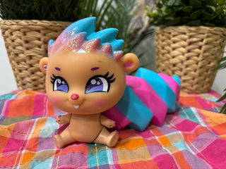 Muñeca de la marca Bellies, un juguete divertido y coleccionable. - Diseño con pelo azul y rosa brillante. - Cuerpo de vinilo. - Cola a rayas rosas y azules.