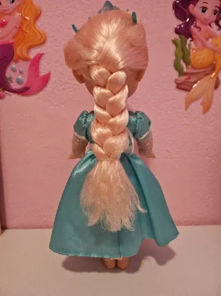 Muñeca de Elsa de Frozen que canta. - Vestido azul brillante con detalles de copos de nieve. - Se ilumina cuando canta la canción. - Corona azul en la cabeza. - Collar con piedra blanca. - Se entega con pilas nuevas. - Tiene sus años,pero aún se le puede dar una segunda vida.