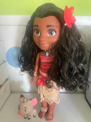 Muñeca de Vaiana con su amigo el cerdito Pua. - Muñeca de Vaiana. - Figura del cerdito Pua. - Horquilla del pelo, pulsera y tobillera. Altura de la muñeca 34 cm aproximadamente. Altura de Pua 9 cm aproximadamente. Nueva sin caja. Nunca se ha usado.
