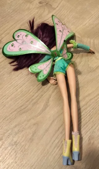 Muñeca de hada con un atuendo brillante y alas decoradas. - Alas con diseño de hojas en verde y rosa. - Cuerpo y piernas de plástico. - Botas amarillas con detalles rosas y suela gris. Venta directa, no realizo envíos.