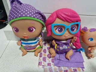 Conjunto de tres muñecos de la popular serie The Bellies. - Muñeco con gorro de dormir morado de lunares. - Muñeco con gafas azules y pelo rosa. - Muñeco pequeño con coletas moradas.