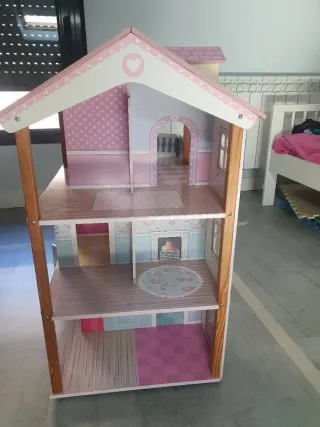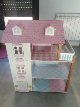 Preciosa casa de muñecas de madera con un diseño giratorio. Casi sin uso , pero en el tejado tiene tiene un pequeño roto que se enseña en la última foto. - Techo rosa con dos buhardillas. - Fachada blanca con ventanas y puerta. - Múltiples plantas con suelos a cuadros rosas y azules. - Balcón con barandilla.