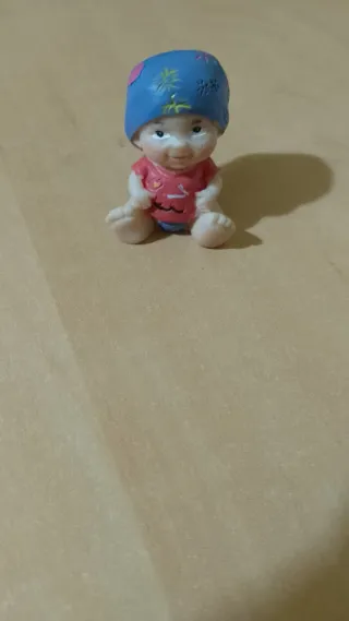Lote de muñecos pequeños y dos miniaturas. - Muñeco con camiseta rosa y pañal. - Dos figuras pequeñas adicionales.