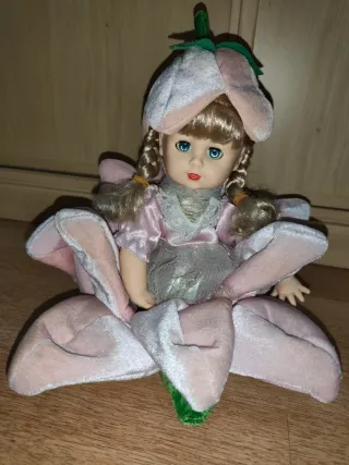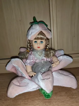 Adorable muñeca con un diseño inspirado en una flor. - Vestido rosa con detalles plateados. - Gorro de flor. - Pétalos de flor en la base. Es antigua, de hace unos 25 años.