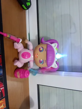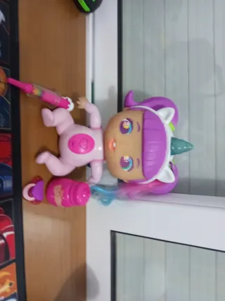 Muñeca Ballies con temática de unicornio, ideal para jugar. Bell - Incluye accesorios como biberón y chupete. - Diseño colorido con pelo azul y morado. - Cuerpo de plástico rosa.