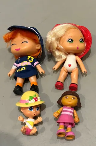 Lote de 4 muñecos. - Incluye un muñeco de Dora. - Un bebé con sombrero. - Un muñeco policía. - Un muñeco con traje de baño. - Un sombrero tarta de fresa.