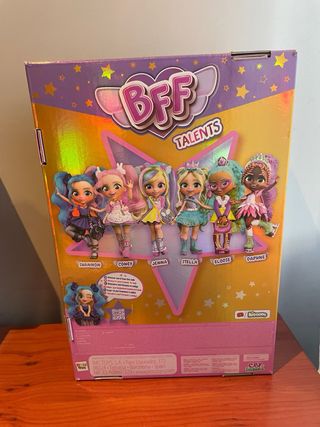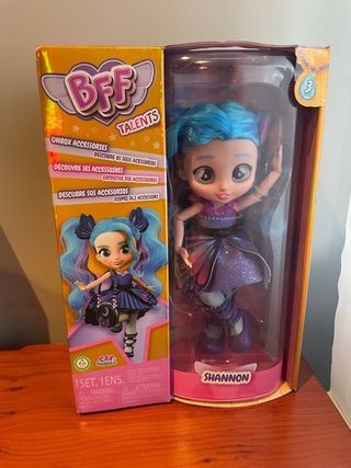Muñeca de la colección BFF Talents, modelo Shannon. Incluye accesorios para desempacar. - Muñeca con cabello azul y vestido morado. - Diseño inspirado en mariposa. - Incluye collar