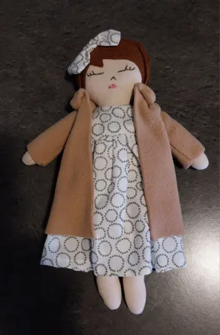 Adorable muñeca de trapo hecha a mano, perfecta para decorar o jugar. - Vestido blanco con estampado de círculos grises. - Abrigo marrón claro. - Lazito blanco en el pelo.