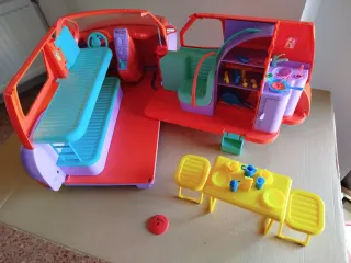 Set de juego de Pinypon que incluye una autocaravana y un coche. - Autocaravana con detalles en rosa y blanco ( tiene alguna cosa rota però de puede abrir y cerrar para jugar). - Coche descapotable en color lila. - Incluye dos muñecas Pinypon.
