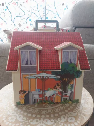 Maletín de Playmobil que simula una casa de muñecas. - Diseño de casa de dos plantas con tejado rojo. - Incluye figuras y mobiliario de exterior. - Ideal para llevar y jugar en cualquier lugar.
