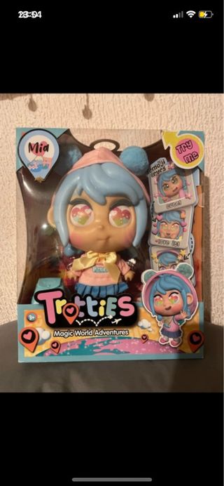 Muñeca Trotties Mia de la colección Magic World Adventures. - Incluye accesorios. - Ojos con diseño de emojis. - Incluye un colgante con la letra 'P'.