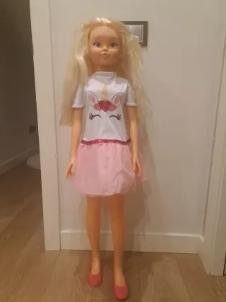 Muñeca grande con vestido rosa y camiseta de unicornio. - Pelo rubio largo. - Vestido rosa con brillo. - Camiseta blanca con estampado de unicornio.