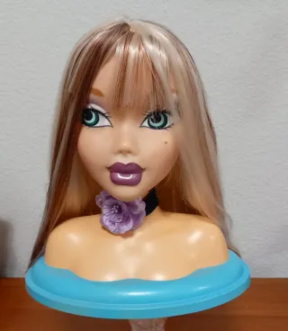 Maniquí de cabeza de muñeca My Scene para peinar y jugar. Vintage año 2003 - Cabello rubio con mechas. - Maquillaje detallado en ojos y labios. - Collar con flor morada.