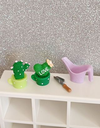 Set de miniaturas de cactus para coleccionar o decorar. Incluye dos cactus en macetas y herramientas de jardinería. - Cactus verde con flores rosas en maceta verde claro. - Cactus en forma de corazón verde con la palabra LOVE y flor blanca en maceta verde. - Pala y rastrillo de jardinería en miniatura. - Regadera morada en miniatura.