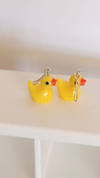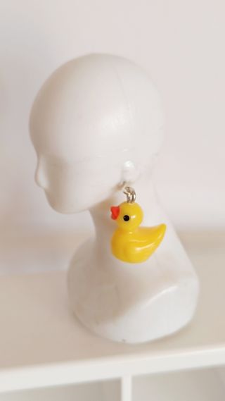 Pendientes con forma de patitos amarillos, diseñados para muñecas. - Diseño divertido de pato de goma. - Color amarillo brillante. - Cierre de enganche plateado.