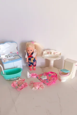Set de muñeca Shelly Jelly con accesorios para el baño. Incluye varios complementos para jugar. - Muñeca Shelly Jelly. - Bañera. - Lavabo con espejo. - Inodoro. - Ropa y accesorios.