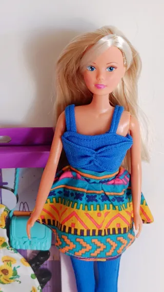 Muñeca Steffi Love con un conjunto de ropa y accesorios. - Incluye un vestido blanco con estampado de girasoles. - Viene con un bolso azul. - También incluye un par de zapatos rosas. - La muñeca lleva un top azul y una falda con estampado étnico, junto con mallas azules y zapatos rosas.