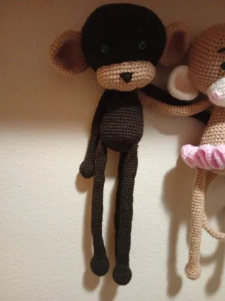 Adorable pareja de muñecos de mono hechos a mano con ganchillo. - Uno de los monos es de color marron. - El otro mono es de color beige y lleva un tutú rosa. - Ojos de seguridad y detalles bordados.