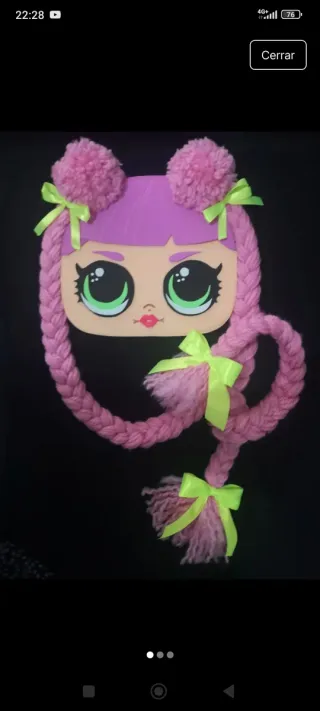 Este organizador de pinzas para el pelo tiene un diseño de muñeca. - Dos pompones rosas en la parte superior. - Trenzas largas de lana rosa. - Lazos verdes decorativos. Mide 70 cm de largo.