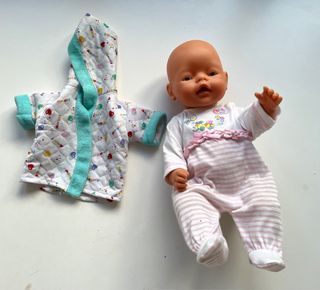Muñeco bebé con un conjunto de ropa. - El muñeco tiene un traje de cuerpo entero a rayas rosas y blancas. - Incluye una bata acolchada blanca con corazones de colores y ribetes turquesa. - le falta el biberón , tomando el biberón hace pis - Mide 42 cm de largo