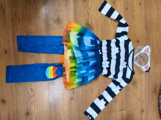 Disfraz completo para niños con diadema de orejas. - Body de rayas blancas y negras. - Tutú de tul con degradado arcoíris (naranja, amarillo, verde, azul). - Pantalones largos azules con detalle de arcoíris en la pierna. - Diadema con orejas de gato/zorro blancas y rosas. Es para 6-8 años