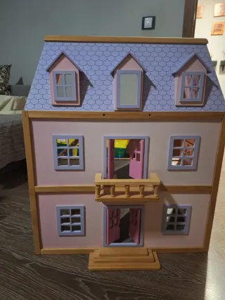 Casa de muñecas de la marca Sylvanian Families. Un hogar detallado para tus figuras. - Diseño de dos plantas con balcón. - Fachada en tonos beige y rosa. - Ventanas y puerta en color turquesa. - Tejado a dos aguas. -con luz Muy poco uso Cada familia x 15€ mas -familia gatos -familia erizos -familia ardillas Precio con TODO 115€ ,precio de la casa con los accesorios 70€ Se entrega en loranca o en plaza de castilla ,no hago envios .