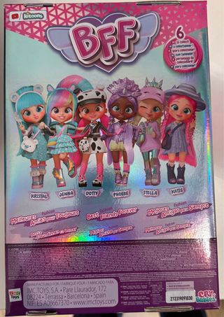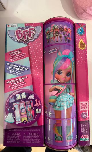 ARTICULO NUEVO: Muñeca Jenna de la colección BFF de Cry Babies. Incluye accesorios para vestir y jugar. - Muñeca con cabello multicolor. - Incluye varios conjuntos de moda y accesorios. -El cilindro se transforma en armario e incluye más de 9 sorpresas, incluyendo ropa y accesorios. - Edad recomendada: 3+ años.