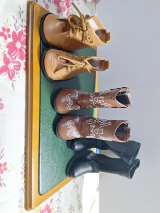 Conjunto de botas para muñecas, perfectas para completar su vestuario. - Botas de estilo cowboy en color marrón. - Botas estilo botín en color negro. - Botines de cordones en color marrón. - Medida de la suela: 7 centímetros.