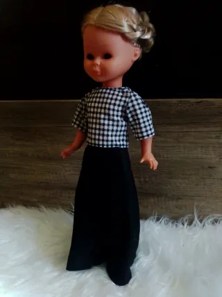 Conjunto de ropa para muñeca Nancy clásica o similar compuesto por una blusa y un pantalón. - Blusa con estampado de cuadros. - Pantalón largo de color negro. Confeccionado a mano