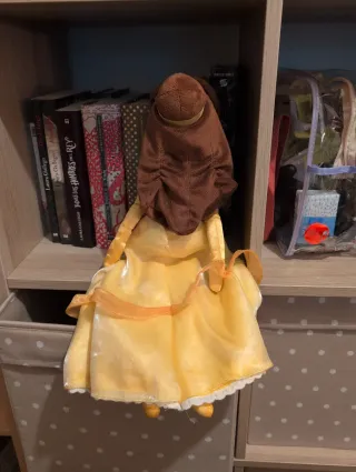 Muñeca de Bella de Disney con su icónico vestido amarillo. - Vestido satinado amarillo con detalles. - Brazos y cara de tela. - Pelo castaño recogido.