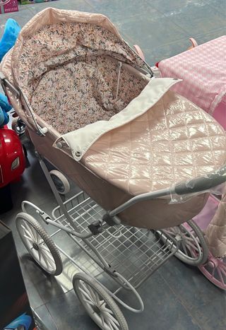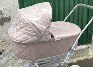 Precioso carro de muñecas con un diseño acolchado y elegante. - Color rosa pálido. - Capota ajustable. - Detalles en gris.