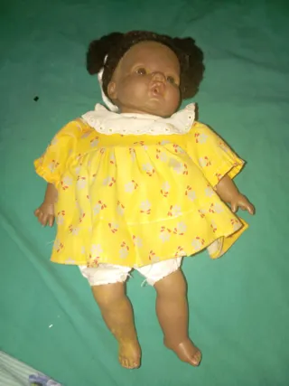 Muñeca de bebé con detalles adorables. Viste un bonito vestido amarillo con estampado floral y un cuello blanco. - Pelo oscuro recogido. - Ropita de bebé incluida.