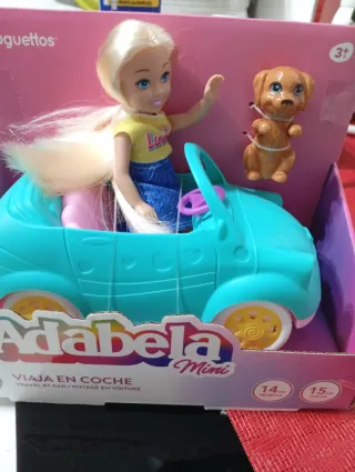 Set de muñeca Adabela Mini con su coche y un perrito. - Muñeca Adabela Mini. - Coche de color turquesa. - Incluye un perrito marrón.