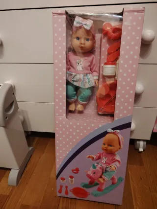 Set de muñeca Baby Mia con accesorios para jugar. - Incluye biberón, orinal y cubiertos. - La muñeca viste un traje rosa con unicornio. - Viene en su caja original.