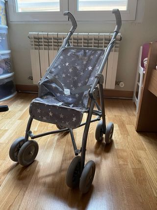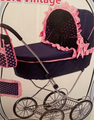 Coche de muñeca con un bonito diseño floral en tonos rosas y encaje blanco. - Capota ajustable. - Incluye un pequeño colchón. - Ruedas para facilitar el movimiento.