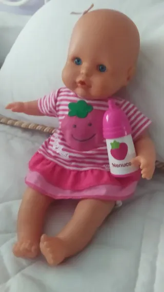 Muñeca Nenuco con su biberón. - Vestido a rayas rosas y blancas con estampado de fresa. - Incluye biberón rosa con estampado de fresa y el logo de Nenuco. Muy nuevo.